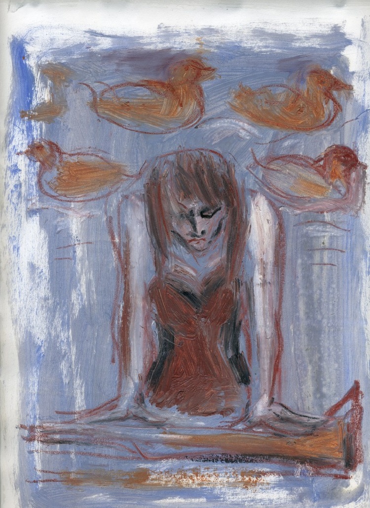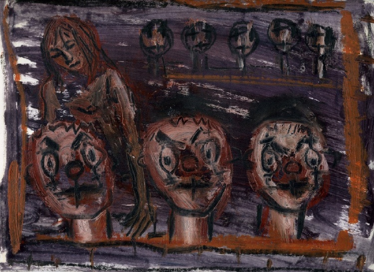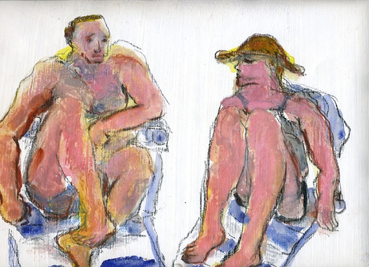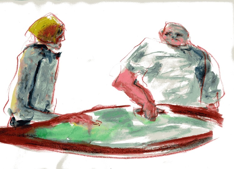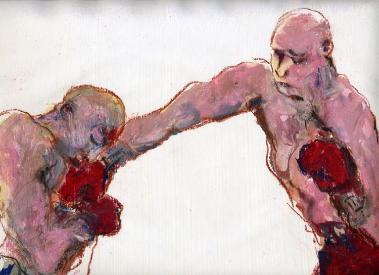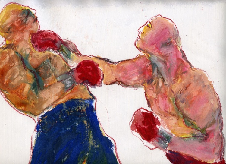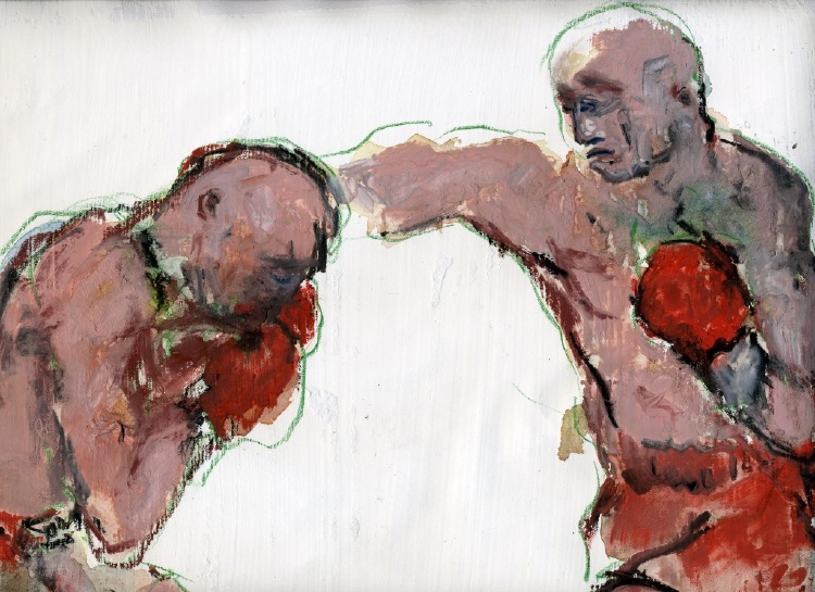 Wurm’s final message—conveyed through her character’s body language—is one of self-causation. Her characters cross their arms, warding off interaction, sealing themselves in their cages of discontent. The gambler keeps his grimace and hand glued to the table, not letting it go lest he find something better. Even the victor in the boxing matches can’t wear a smile as keeps his arms as close to his chest as he can. Wurm draws her characters in pitiable situations and depicts them as lost cases, their inability to open up apparent through their stances and expressions. In this manner, Wurm’s art conveys its message regarding the various activities these characters are engaged in.